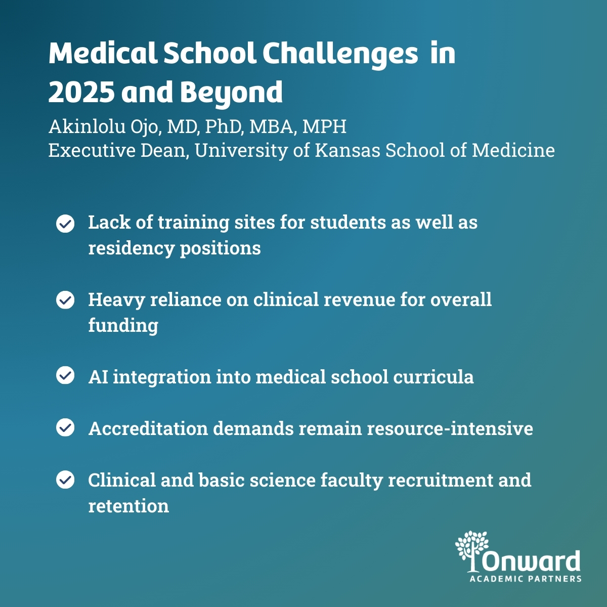 Onward Academic Partners recently had the opportunity to speak with with Akinlolu Ojo, MD, PhD, MBA, MPH, who currently serves as the Executive Dean of the University of Kansas School of Medicine.